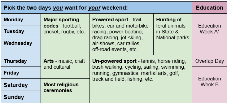 - Two 4-day education weeks are proposed with longer hours per day than now. On Thursday both A and B students are on campus for assemblies and sport.