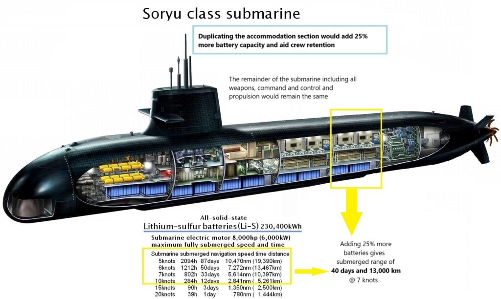 Sōryū / Taigei | Mitsubishi / Kawasaki | 7 | 4 weeks with Li-S batteries. |